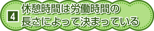 ◆休憩時間は、労働時間の長さによって決まっています。労働時間が6時間をこえる場合には45分以上、8時間をこえる場合には1時間以上の休憩時間が与えられなければなりません。(労働基準法第34条)労働者は休憩時間を自由に使うことができます(自由利用の原則)。